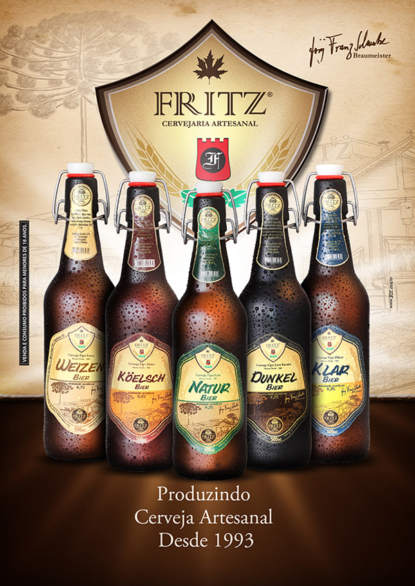 Since 1993, the brewery’s German Fritz is one of the oldest in Brazil and started as a hobby master -brewer Jörg Franz Schwabe. Nowadays Fritz produces five types of beers. We create the names and developed labels for each product individually, rescuing the authentic German culture but with a modern colors, fonts and shapes. The bottle is unique, imported from Germany along with the 5-liter keg.